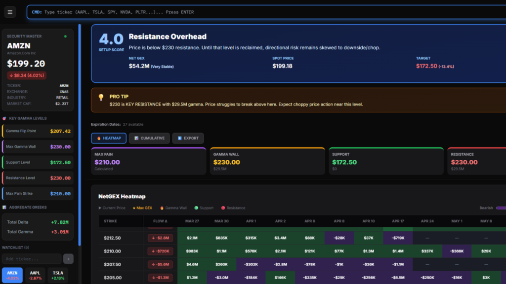 AMZN’s Gamma Exposure (GEX) today is $54.2M — classified as Very Stable and positive. However the AI setup score is 4.0 — Resistance Overhead — because the $230 gamma wall is creating a powerful structural ceiling 15.5% above current price. AMZN is trading at $199.20, down 4.02%, and sitting $8.22 below the critical gamma flip point at $207.42.