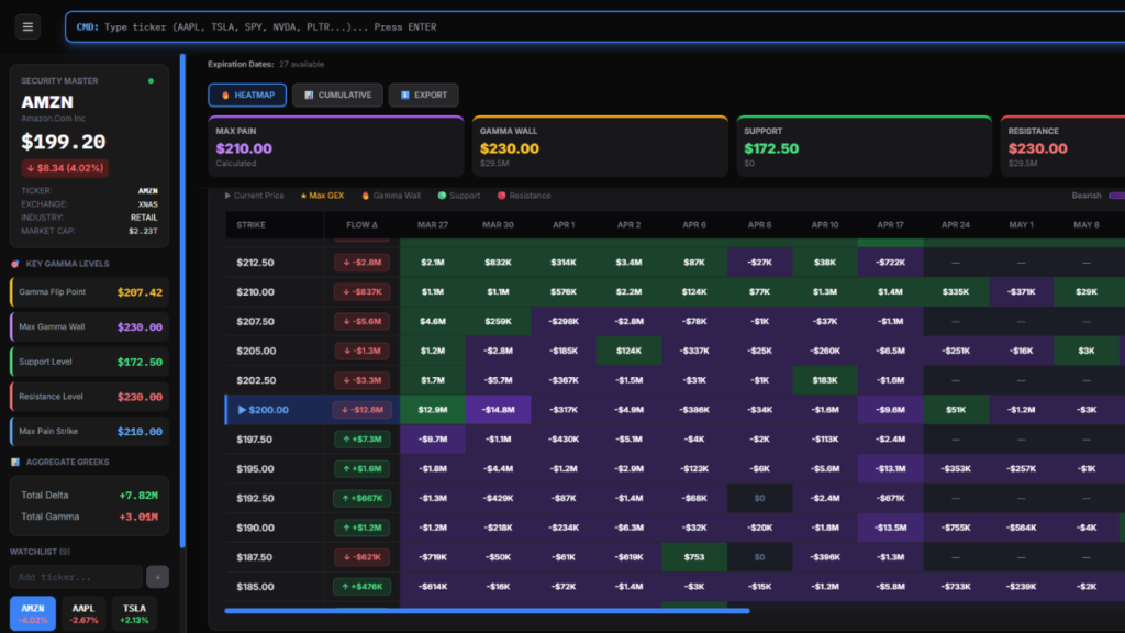 The $230 gamma wall is the ceiling. The $207.42 gamma flip is the regime indicator. The $200 level is today’s battleground. The $172.50 put wall is the structural floor. These are the four levels every Amazon options trader must know today.